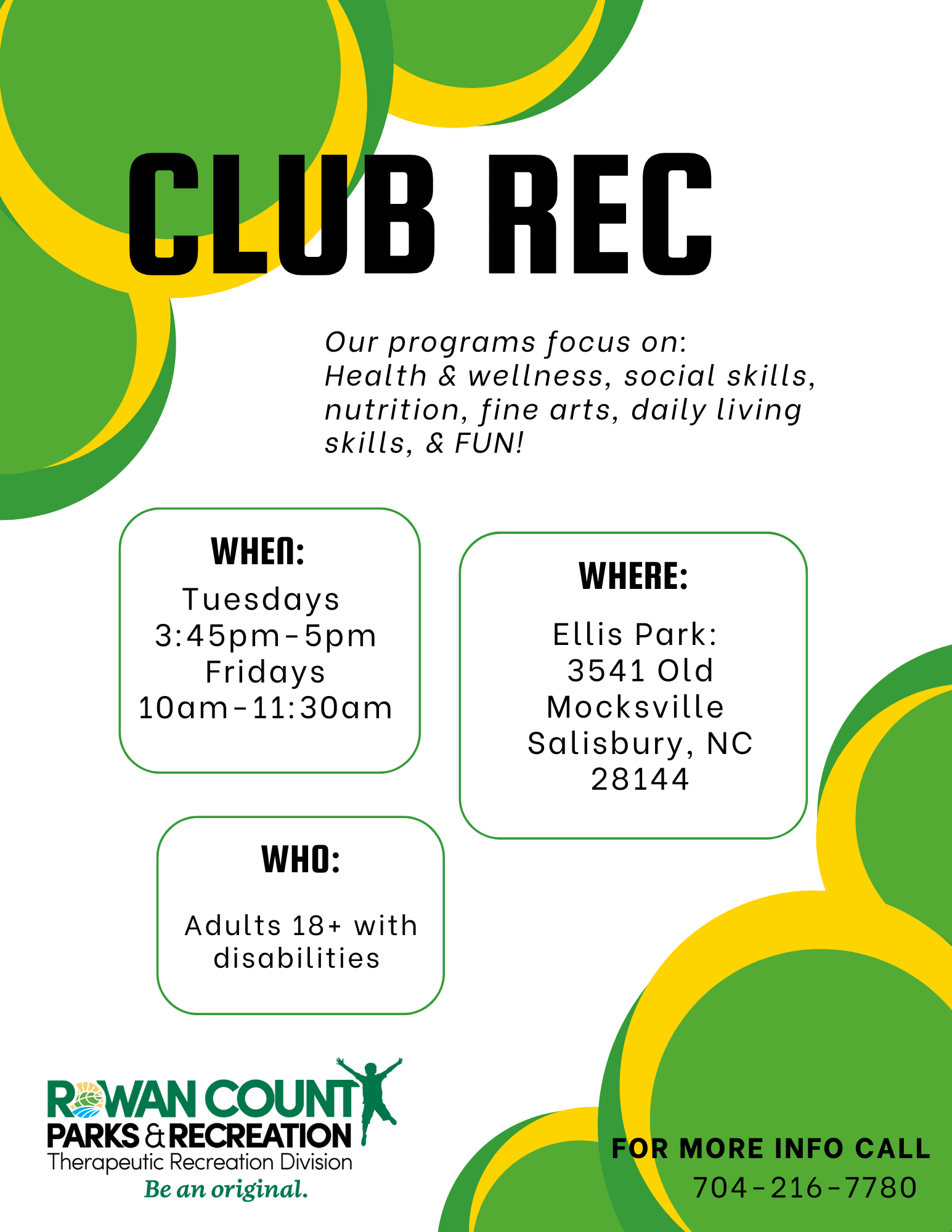 For additional information or to register for programs, please contact the Therapeutic Recreation Division at 704-216-7780. To volunteer, please complete the Volunteer Form (PDF).